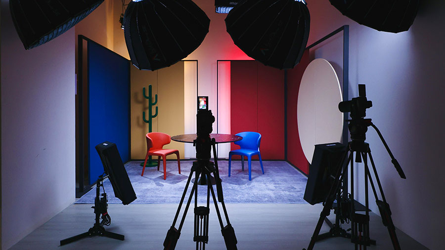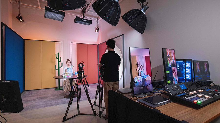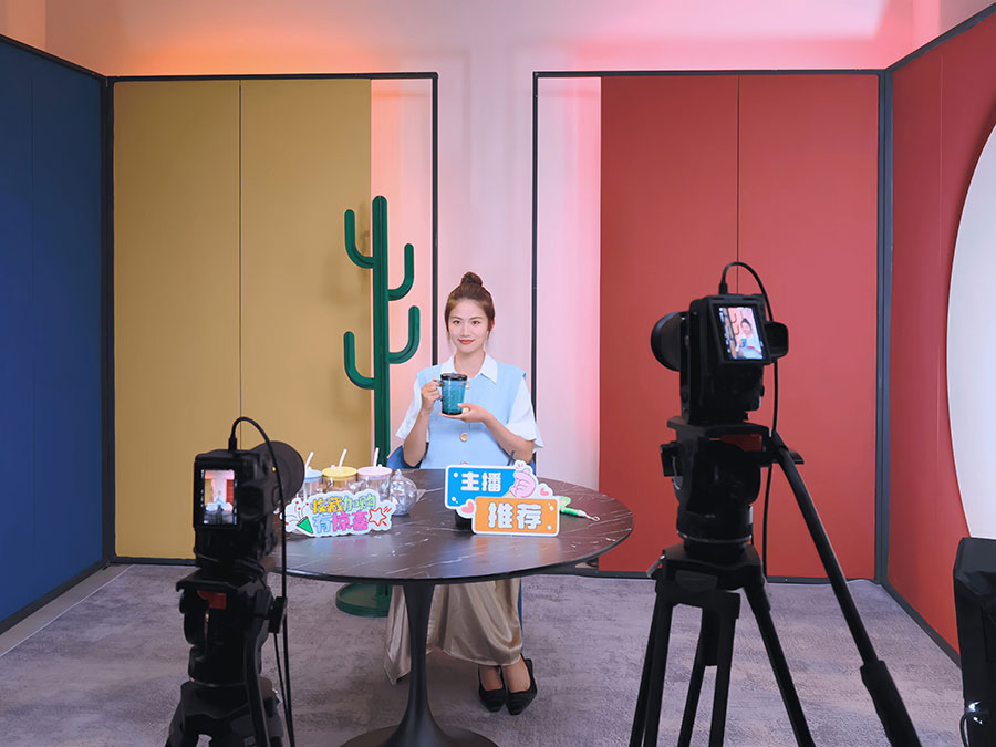場景設(shè)計:選用品牌色系的輕量化材質(zhì),采用吊頂方鋼提升空間利用率,同步優(yōu)化聲學(xué)環(huán)境,打造專業(yè)影棚質(zhì)感;