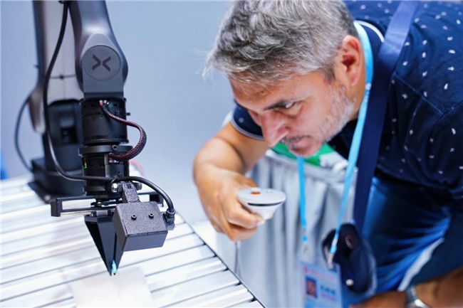 展會上,視源股份機器人系列產品集體亮相,成為海內外客商關注的焦點。MAXHUB A3 智能柔性機械臂以“高速輕量、即插即用”為亮點,自重低于6kg,運動速度超過5m/s,重復定位精度達±0.1mm,支持多種開發(fā)語言與VR遙操作,已在工業(yè)分揀、職業(yè)教育等領域實現應用落地。