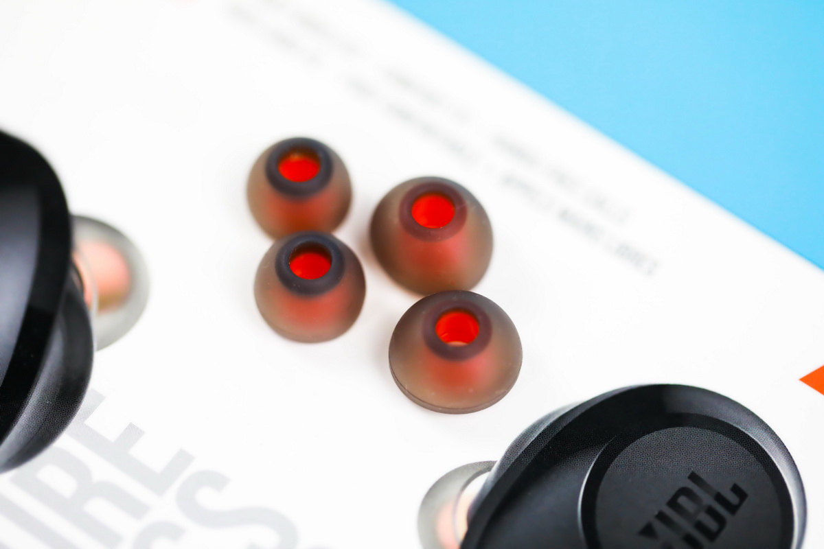 除了說(shuō)明書(shū)、保修卡等文字資料之外,JBL TUNE120TWS還附送了三副彈性極佳的硅膠耳套,半透明磨砂質(zhì)感,隱約可見(jiàn)紅色的內(nèi)部結(jié)構(gòu),極富動(dòng)感。