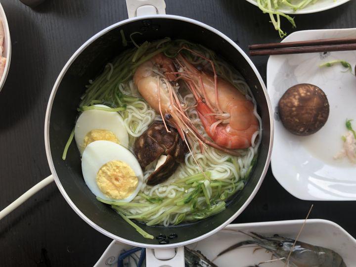 首先,調(diào)節(jié)檔位至最大檔,在鍋中添加同樣容量的水,待你聽(tīng)到翻滾地響的時(shí)候,說(shuō)明水已預(yù)熱完成(上面已經(jīng)述測(cè)了,這里不贅述),可以放入面和香菇,煮一會(huì)依次放入鮮蝦、豆苗,最后放入切好的雞蛋(預(yù)熱時(shí)順便煮好)。
