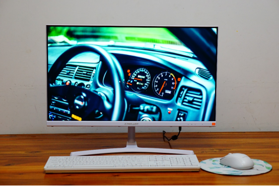 首先映入眼簾是的一塊23.8英寸的窄邊框屏幕,這塊窄邊框屏幕的型號是SKM9750AIO,它的具體參數(shù)如下:86%屏占比,3000:1對比度,窄邊框距3mm邊框,顯示位寬8-bit,可視角度178°廣視角,可顯示色域99%RGB,分辨率支持Full HD 1920*1080,刷新率60Hz。