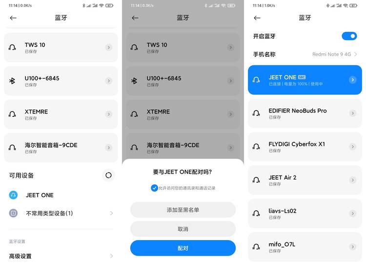 手機打開藍牙,點擊搜索藍牙設備,找到“JEET ONE”,點擊連接即可。