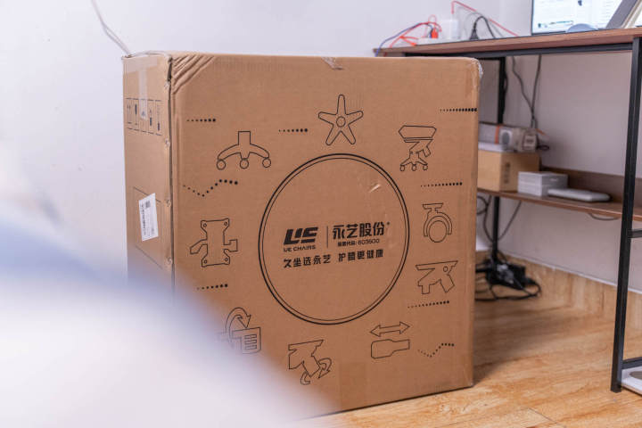 我拿到的這款是永藝電腦椅也黑色款,毛重有14.2公斤,凈重14.4公斤。整個(gè)包裝還是有些大的,不過還好快遞是直接送到家里面的。
