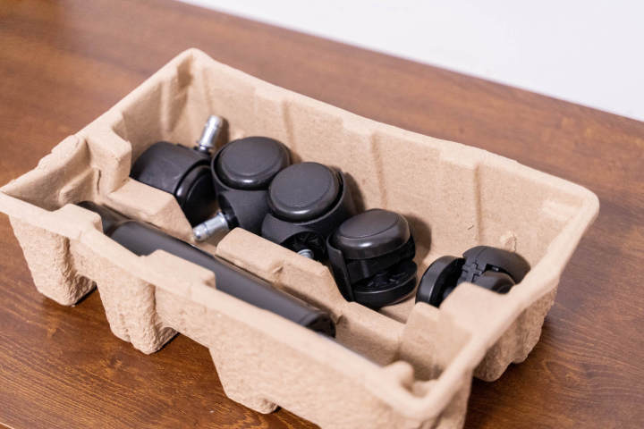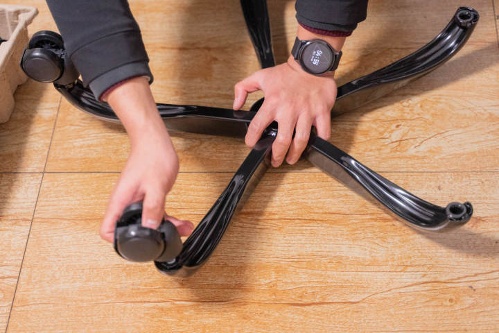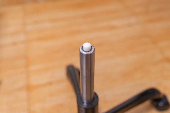 第一步,給椅腳裝上萬向輪,這款萬向輪的安裝是無需螺絲的,只需要將萬向輪插入支撐腳的孔洞即可。