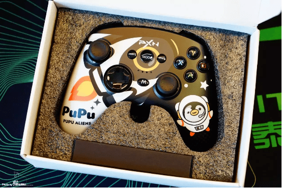 這款PXN-P20無線游戲手柄采用了白色的簡單紙盒包裝,打開包裝后,我們就可以看到一個非常特別圖案的P20游戲手柄,這款P20手柄是PUPU Aliens 特別版,采用的是白色火箭+黑色太空為背景的噗噗星人太空員的圖案,非常特別和可愛。