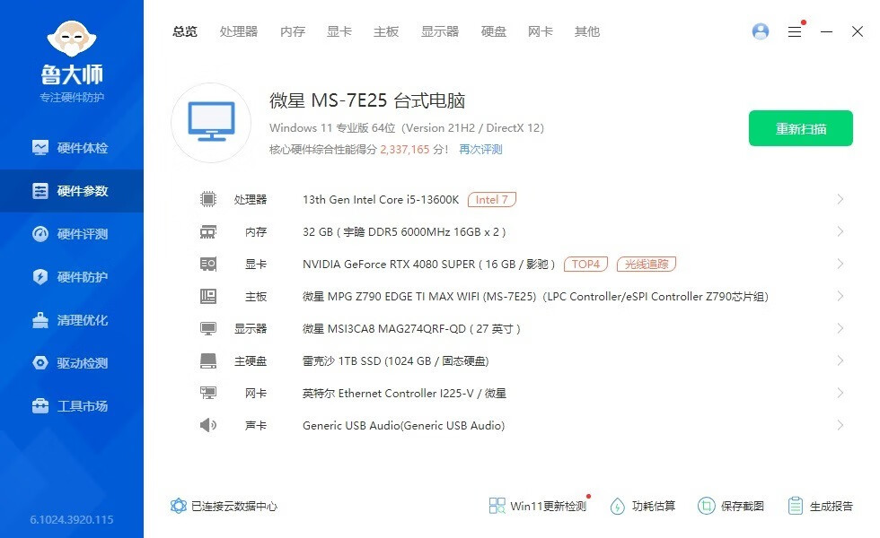 ▼整機(jī)配置一覽,處理器是13600K,主板是微星的Z790刀鋒MAX,顯卡是影馳的RTX4080 Super星曜OC。