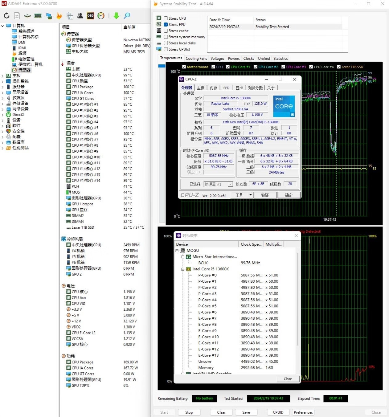 ▼簡(jiǎn)單優(yōu)化下處理器的核心電壓,稍微降一點(diǎn),單烤FPU測(cè)試,處理器功耗在158W左右,大核心睿頻5.1GHz、小核心睿頻3.9GHz,核心溫度穩(wěn)定在96℃,表現(xiàn)還可以。
