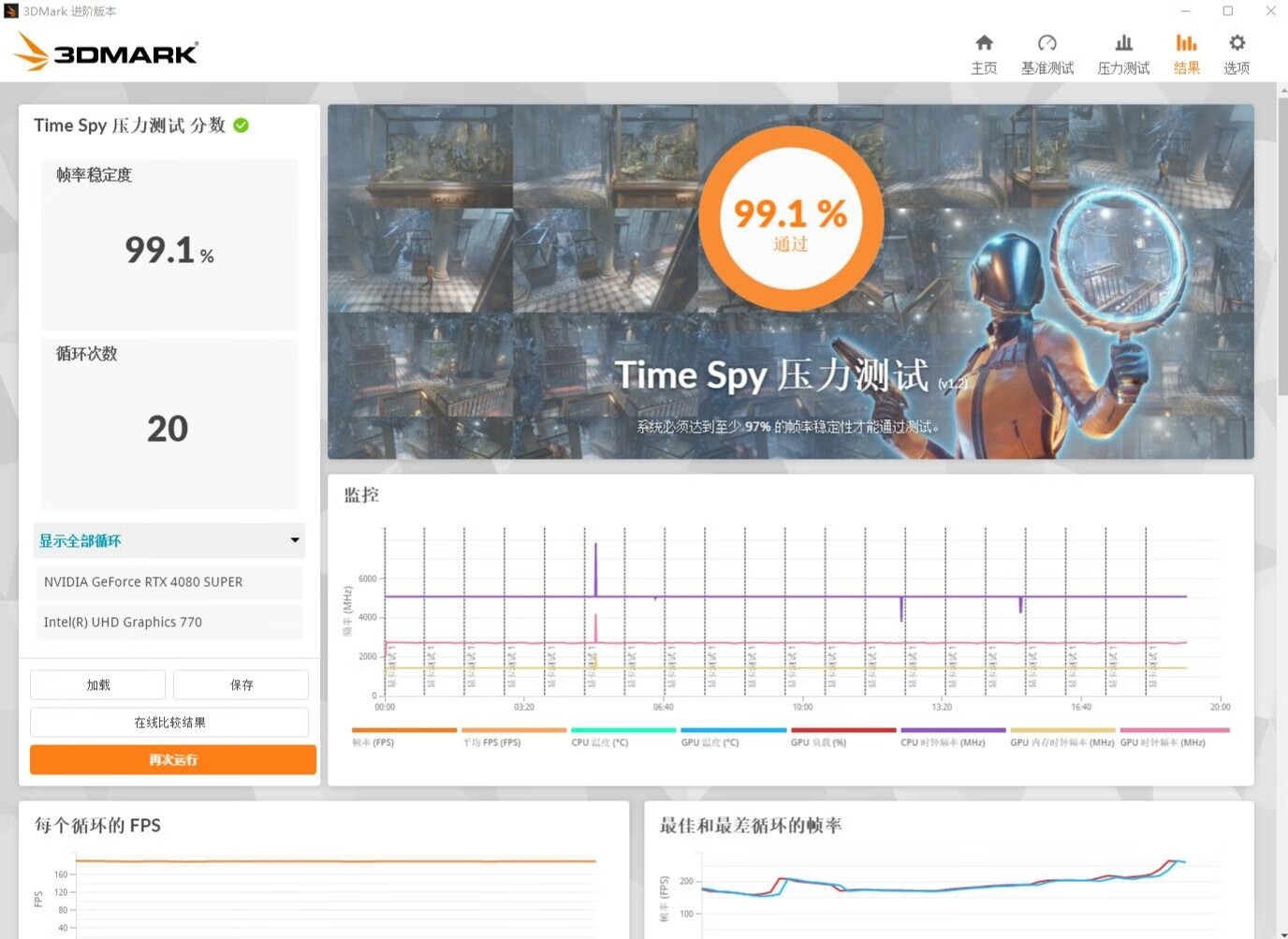 ▼最后跑個(gè)3Dmark的壓力測(cè)試,TS模式,幀數(shù)穩(wěn)定率在99.1%,非常穩(wěn)定。