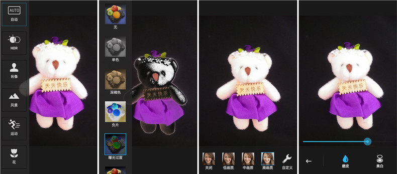 主攝像頭采用5p鏡頭,擁有F2.2光圈。照相機(jī)有全景、錄像、拍照模式。拍照設(shè)置中有多場景、濾鏡選擇,還有低中高三檔自動美顏,可自定義磨皮、美白功能。