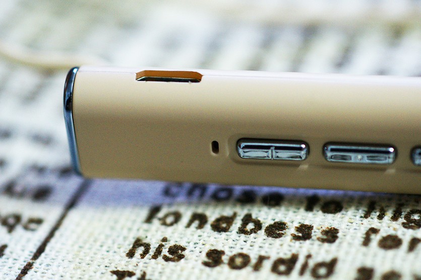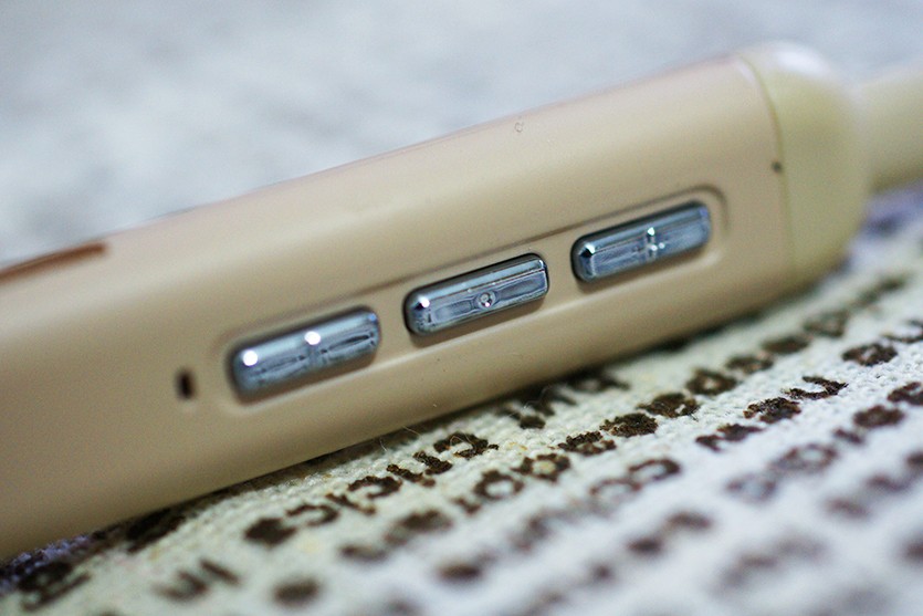 三個(gè)按鍵均為金屬材質(zhì),可以控制播放/暫停、音量加減(切歌),這和其他耳機(jī)的操控類似,就不必多說了。緊挨著按鍵的是麥克風(fēng),因?yàn)檫@款耳機(jī)是支持語(yǔ)音通話的。側(cè)面是Micro USB接口的充電口,相當(dāng)于所有的按鍵和接口都集中在同一側(cè)。