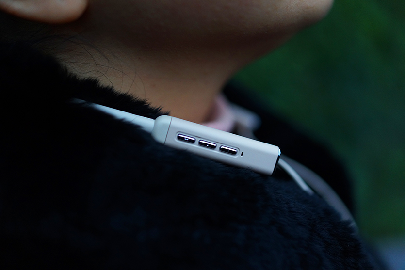 掛在脖子上的時(shí)候,將兩個(gè)耳機(jī)頭輕輕靠近,它們便會(huì)自動(dòng)吸附在一起,可以防止甩來甩去,看上去還挺時(shí)尚的。