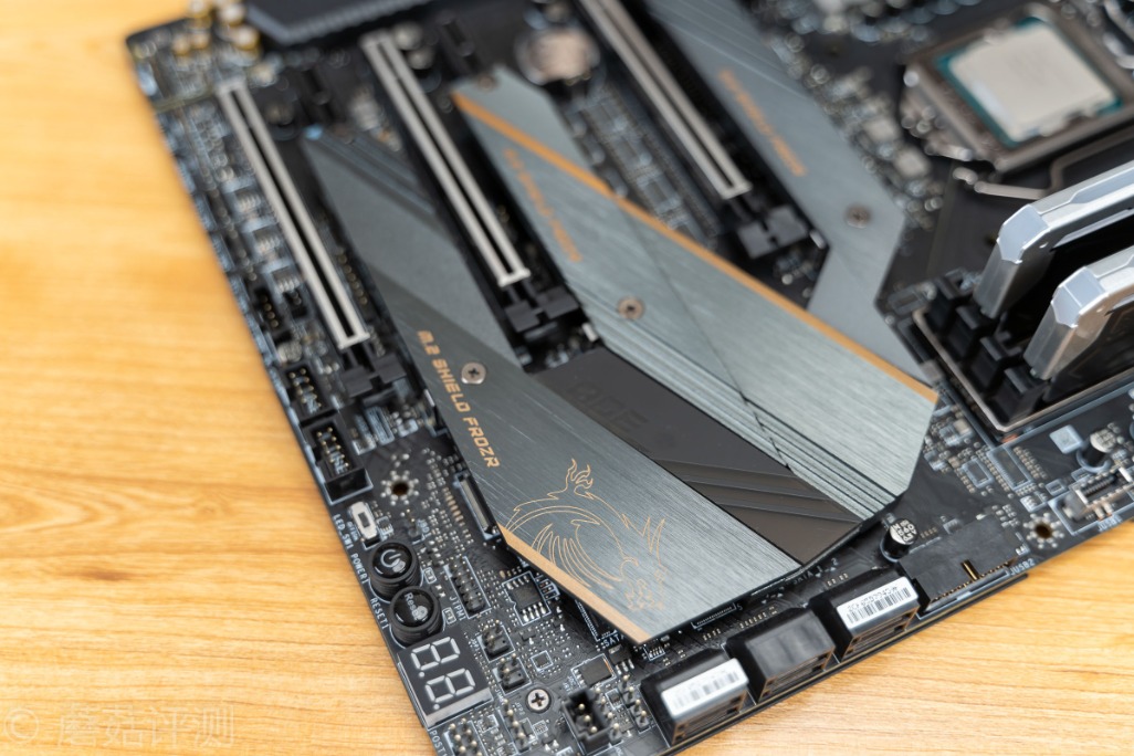 ▼然后蓋上主板的M2散熱金屬片,這里還有一個(gè)微星的金龍LOGO。