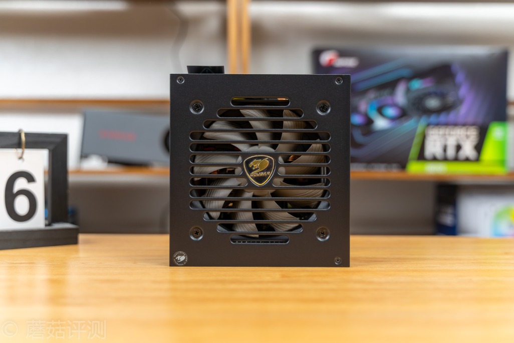 ▼骨伽的電源,雖然是電源,但是外觀顏值依然很漂亮。中間是骨伽的LOGO,內(nèi)部灰色的是散熱風(fēng)扇,扇葉上有豐富的紋理,用于降噪。
