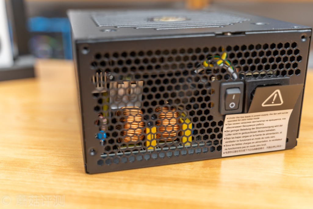 電源,骨伽的這個(gè)電源用料很不錯(cuò),顏值一流。散熱風(fēng)扇上有各種紋理設(shè)計(jì),很漂亮,運(yùn)行時(shí)的風(fēng)扇噪音很小,不錯(cuò)。