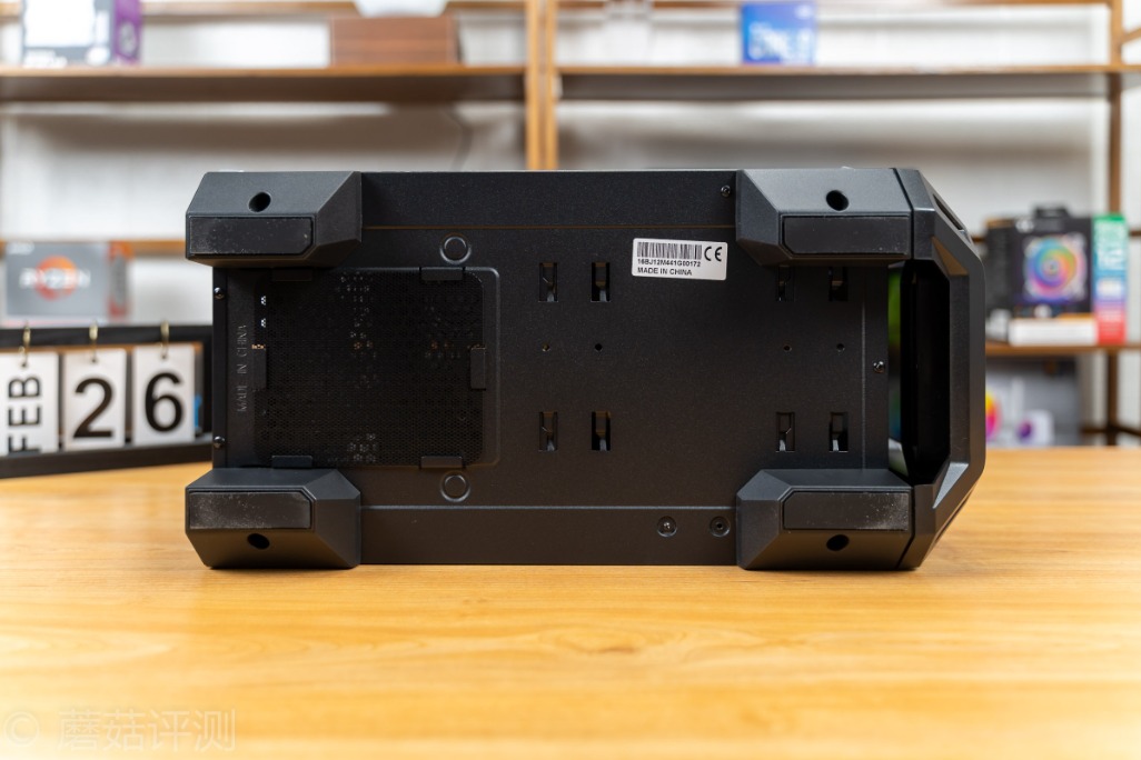 ▼機(jī)箱底部,四個(gè)碩大的防滑腳墊,左側(cè)有金屬防塵網(wǎng)。