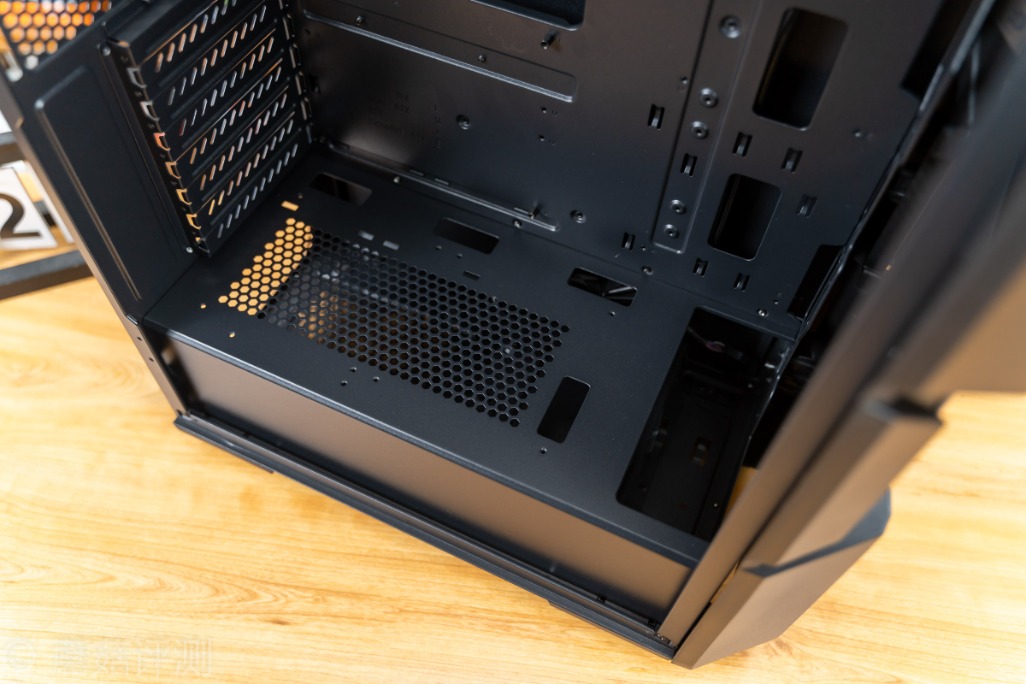 ▼魔影i7這款機(jī)箱的電源倉空間不錯(cuò),標(biāo)準(zhǔn)的ATX規(guī)格的電源可以輕松安裝。