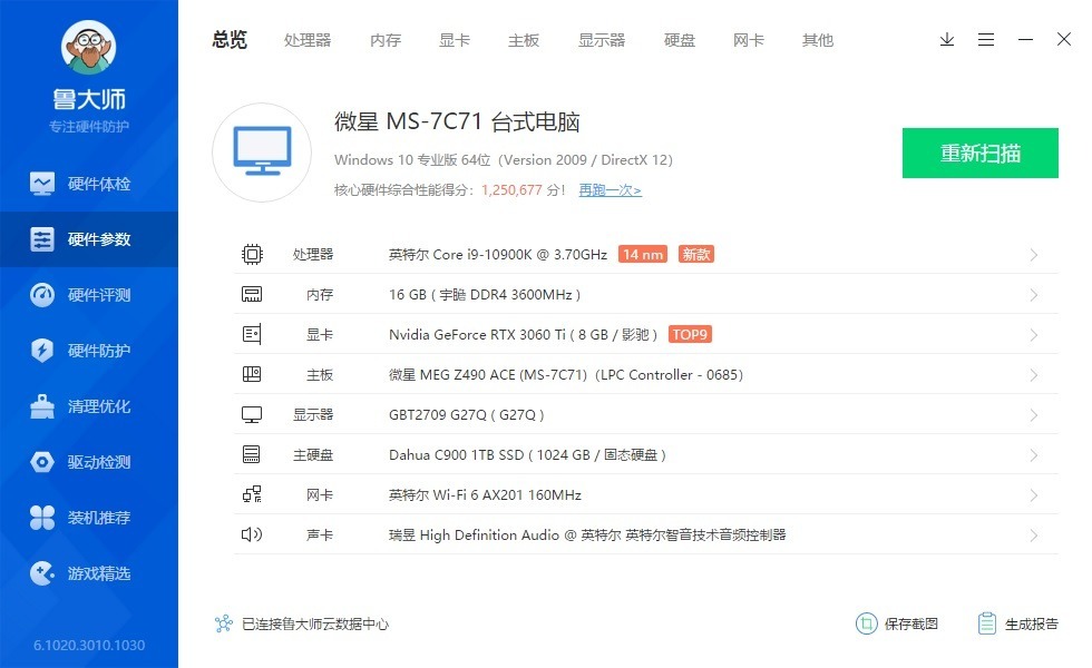 ▼整機(jī)配置一覽,處理器是10900K,主板是微星的Z490 ACE,顯卡是影馳的RTX3060Ti金屬大師OC,電源是骨伽的GEX650,散熱是骨伽的AQUA240一體式水冷,機(jī)箱是骨伽的魔影i7。
