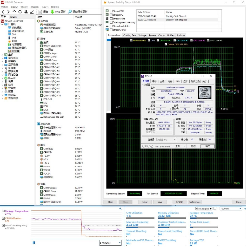 ▼散熱測試,室溫20℃左右,日常待機(jī),處理器溫度27℃左右,核心溫度在25℃左右波動(dòng),顯卡溫度26℃。