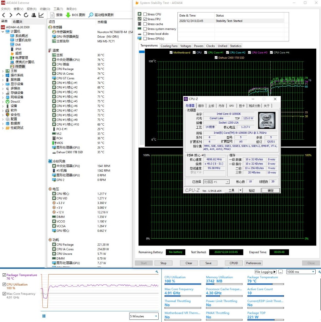 ▼單烤FPU測試,處理器溫度76℃,處理器功耗221W,核心溫度在72℃左右。