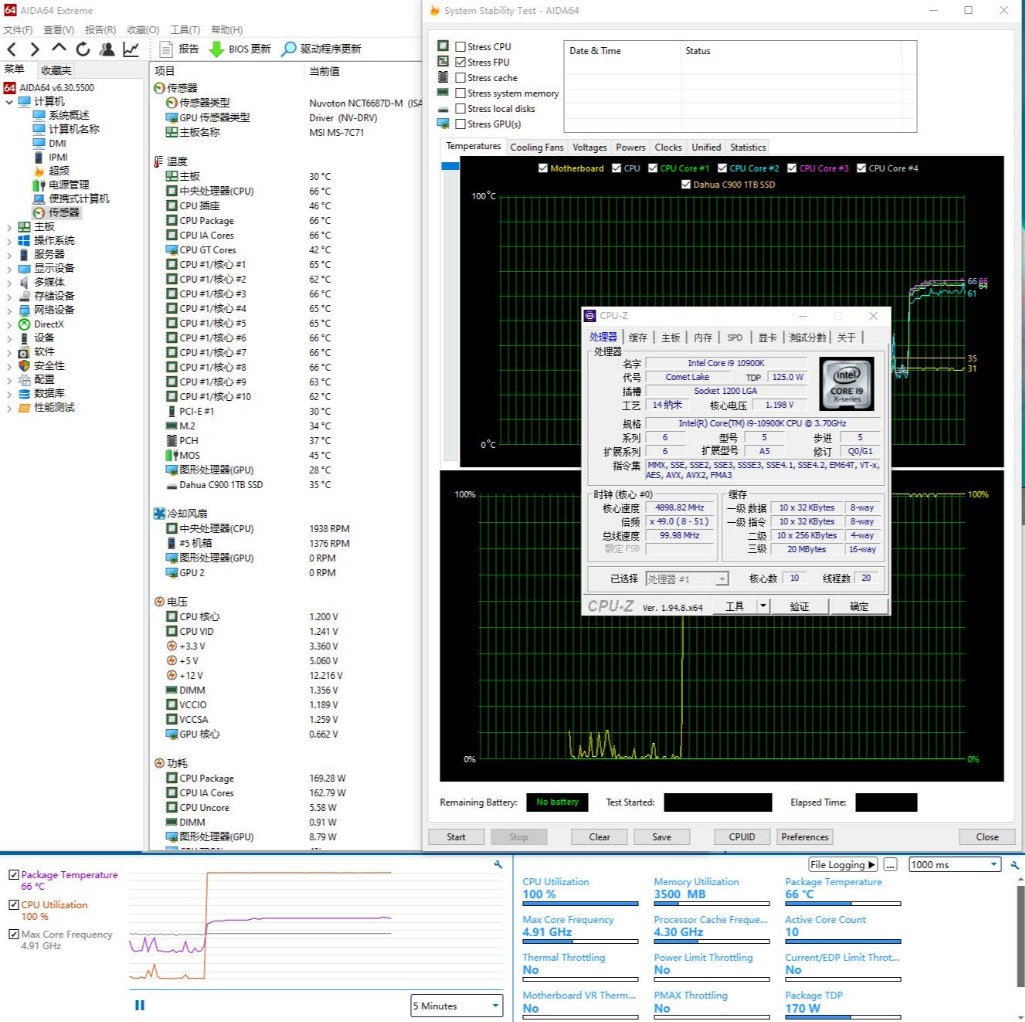 ▼跑個(gè)CPU-Z的壓力測試,處理器溫度66℃,處理器功耗170W,核心溫度62℃左右。