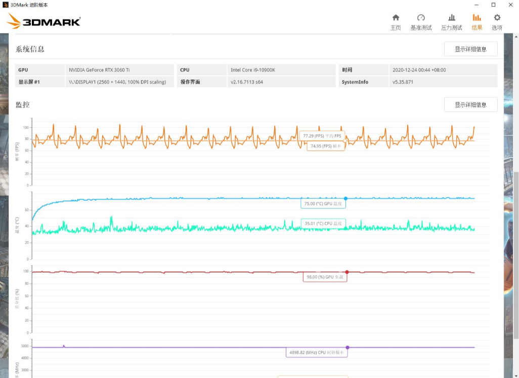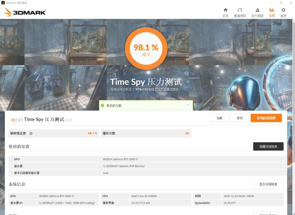 ▼最后跑個(gè)3Dmark的壓力測試,TS模式,幀數(shù)穩(wěn)定率98.1%。