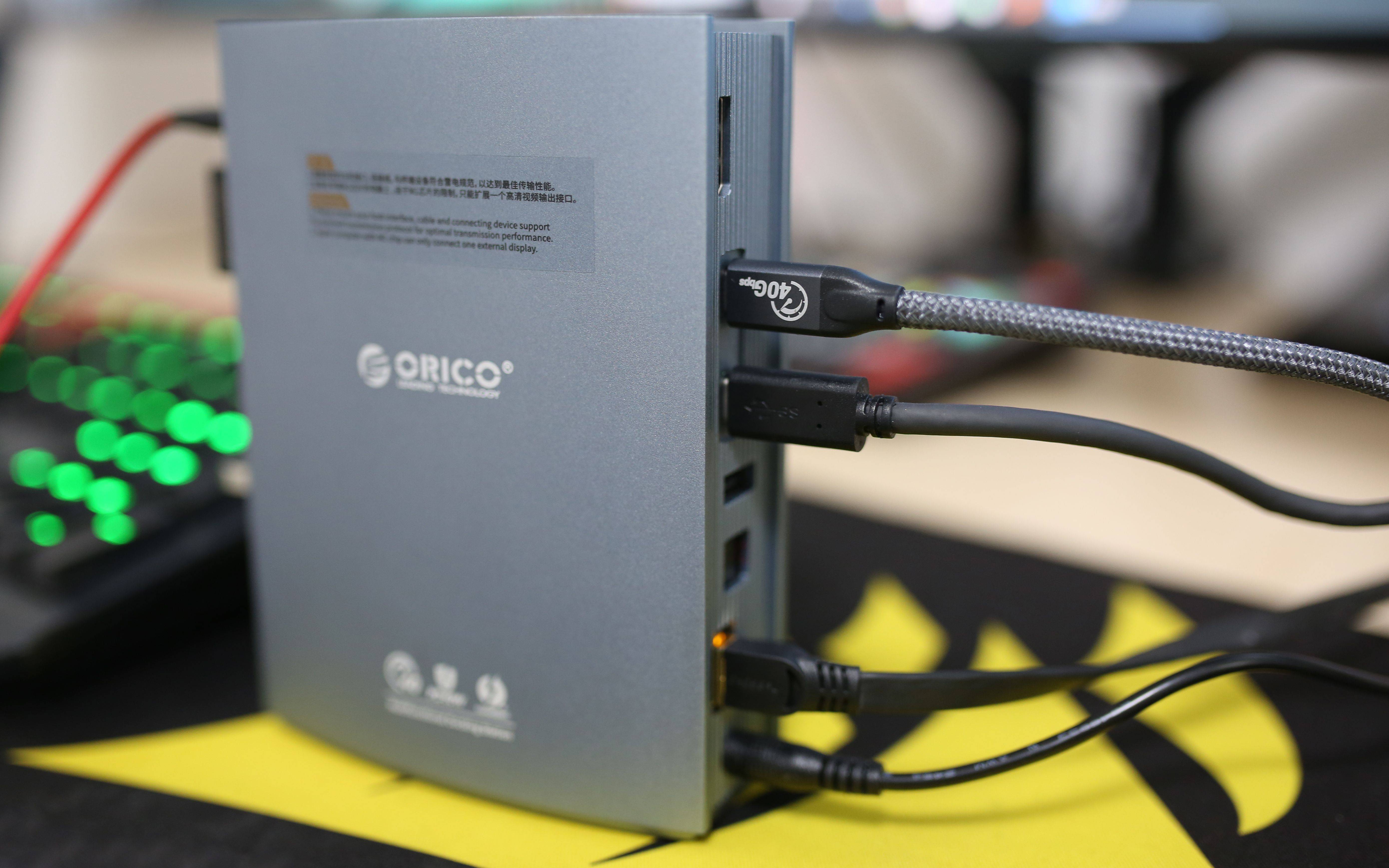 使用時(shí)只要將DC接口插入拓展塢底部的電源接口即可,用隨機(jī)附帶的40Gbps數(shù)據(jù)線連接到電腦主機(jī)的雷電接口就可以使用了。